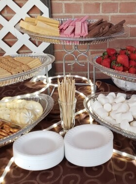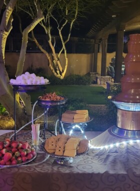 Complete Setup & Equipment – We provide napkins, plates, linens, silver trays, wooden skewers, and lighting for a beautifully arranged chocolate station.